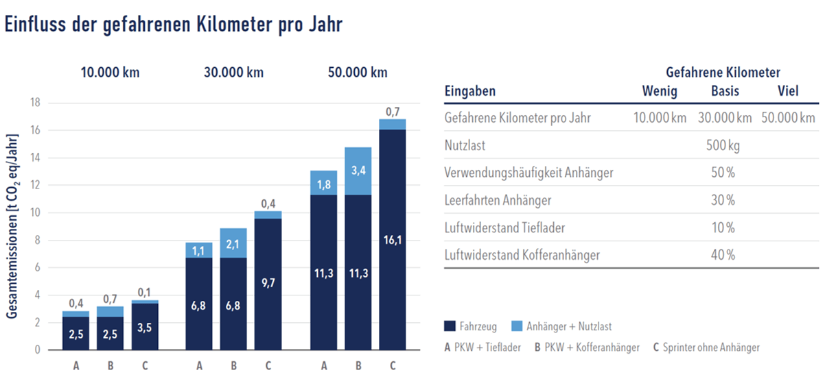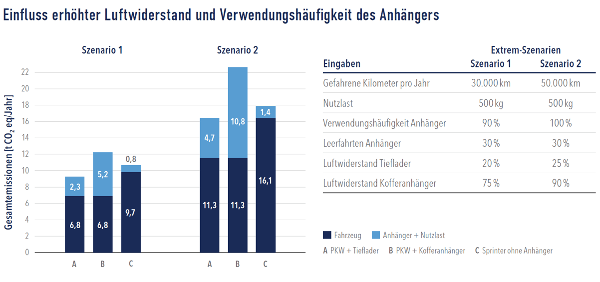 Die Ergebnisse der Studie zeigen, dass die Gesamtemissionen der Varianten „Pkw mit Anhänger“ in den meisten betrachteten Szenarien niedriger sind als die der Variante „Sprinter ohne Anhänger“. Dabei haben die gefahrenen Kilometer, der Luftwiderstand und die Verwendungshäufigkeit des Anhängers den größten Einfluss auf die CO2-Bilanz. Die transportierte Nutzlast spielt hingegen eine geringere Rolle.