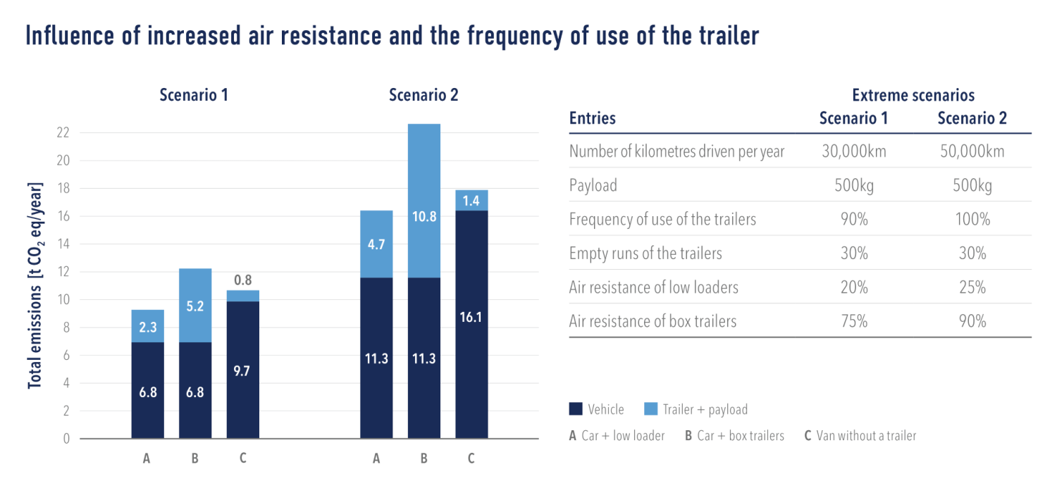 The findings of the survey indicate that the total emissions of the “car with trailer” variants are lower in most of the scenarios examined than those of the “van without a trailer” variant. The key influencing factors on the CO₂ balance are the mileage driven, air resistance, and trailer usage frequency. The transported payload on the other hand plays a lesser role.
